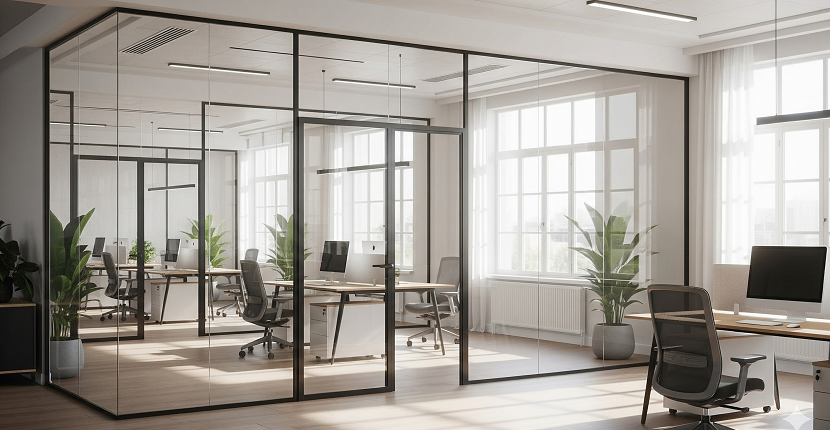 No se trata de una simple pared de cristal. Una mampara acústica está construida con: